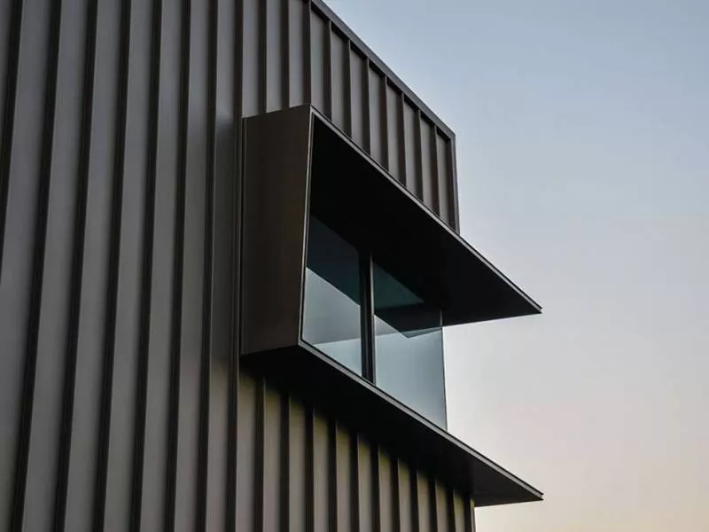 Unha vez finalizado o marco de aceiro, o sistema de tellados está instalado, normalmente consistente en paneis metálicos illados ou materiais de membrana dunha soa capa. As paredes exteriores, se se inclúen no deseño, tamén se instalan usando paneis metálicos, ladrillo ou outros materiais de revestimento.